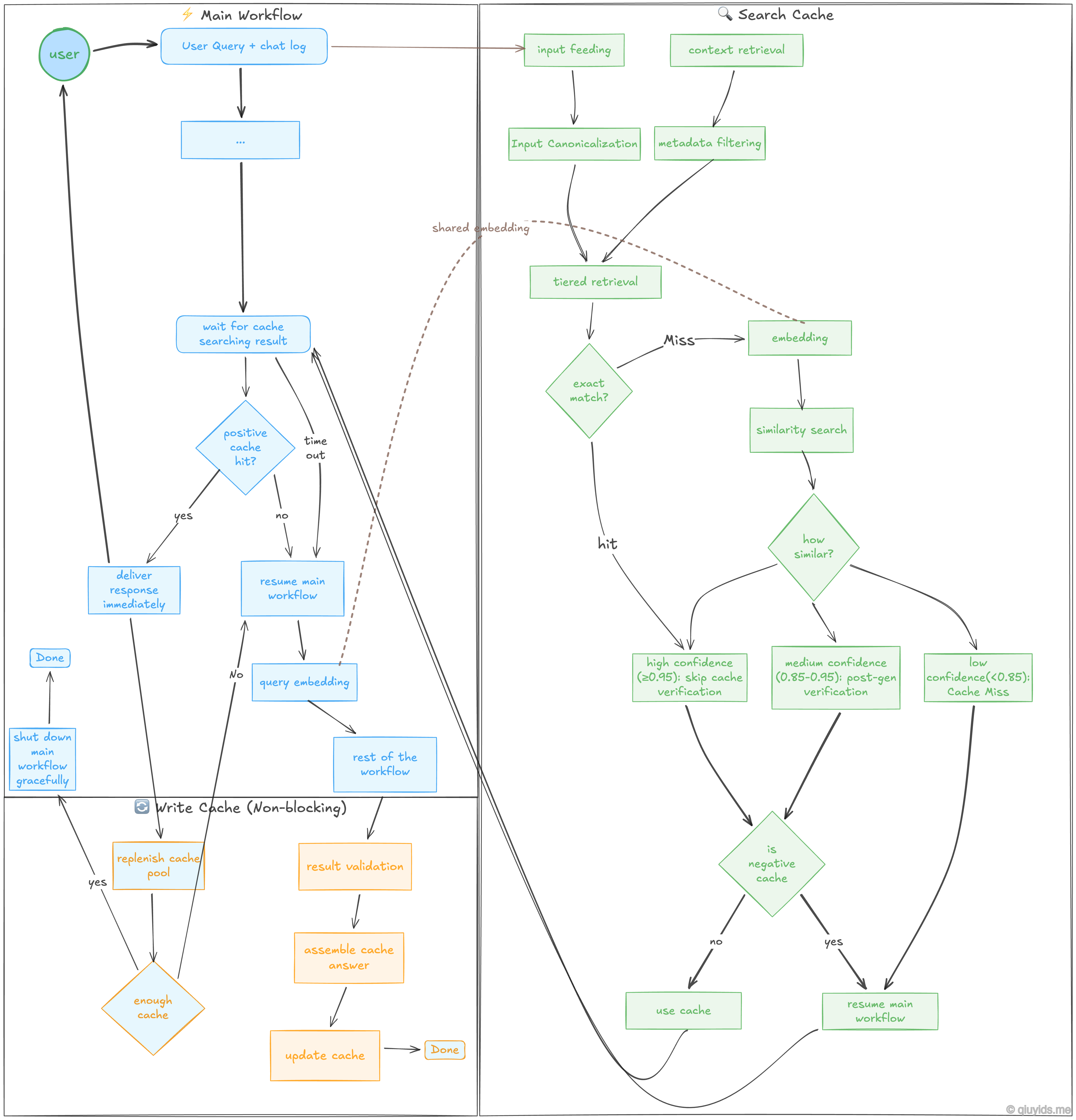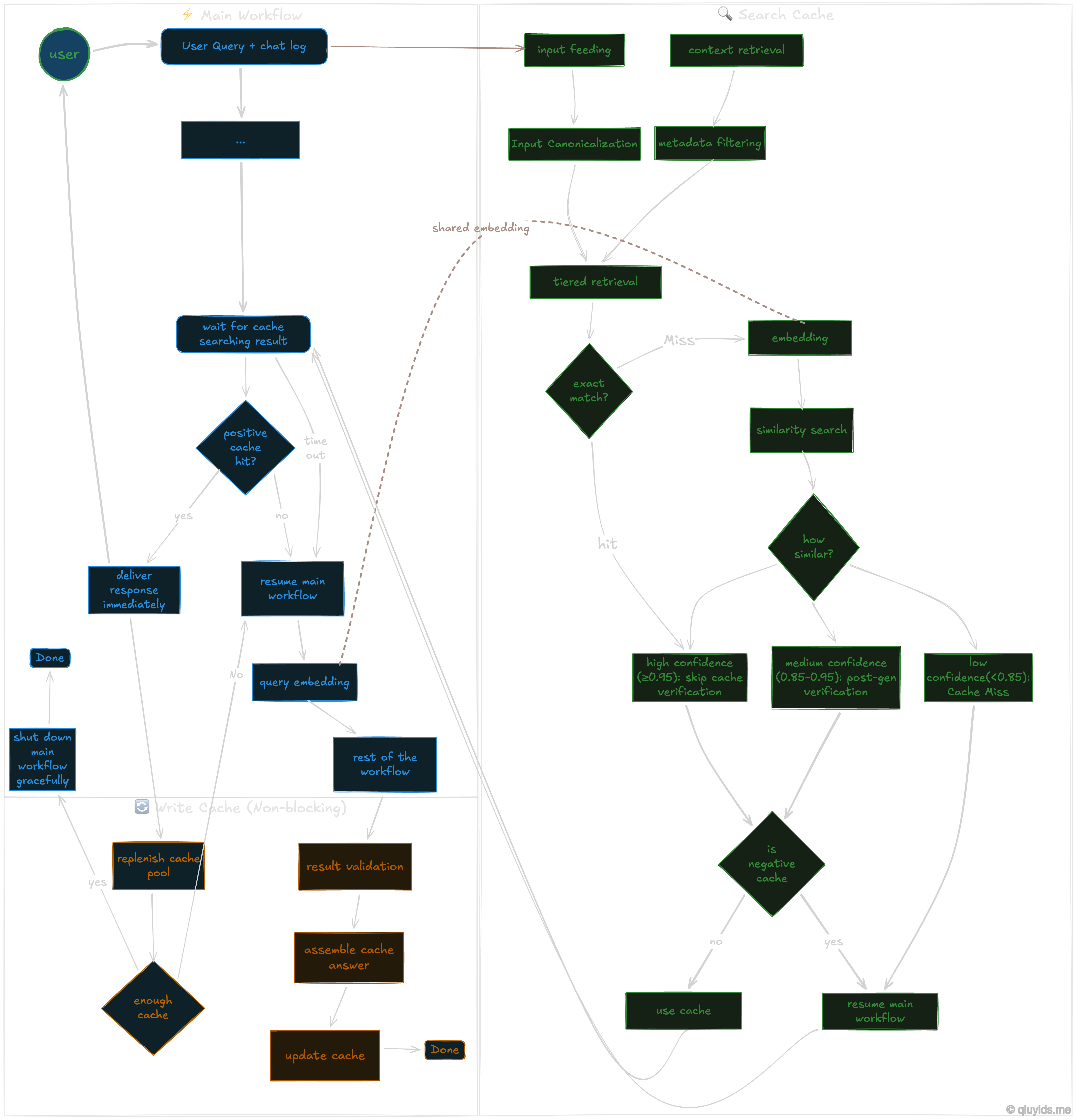 In this post, I think it would be a great idea to provide a workflow diagram incorporating the major points that I previously discussed. Though this might seem like over-engineering for a simple application, these decision points help build a more robust system with semantic caching.